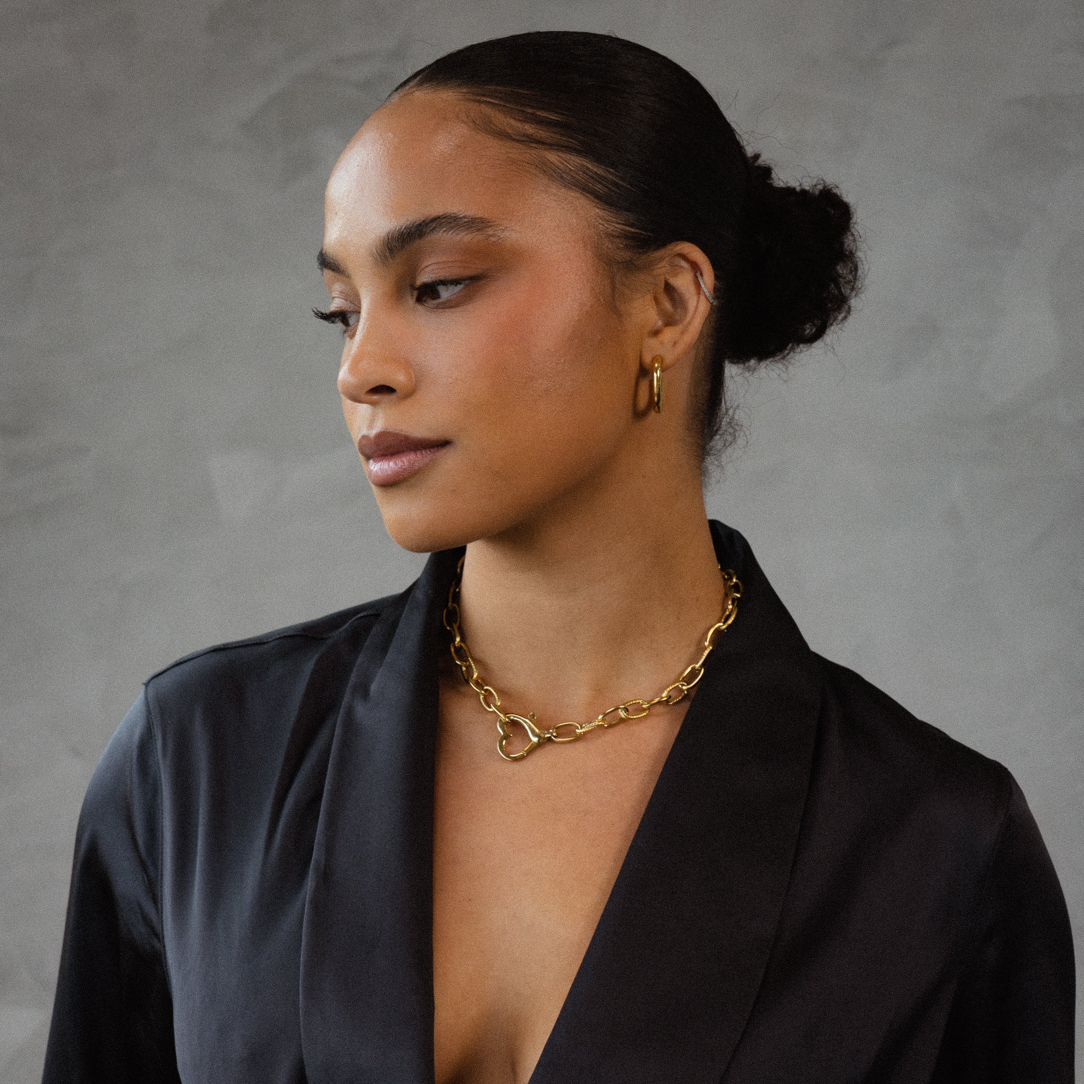Finished with a smooth, polished shine, the piece feels elegant, and intentionally built. Wear it closed in front as a statement, or rotate the clasp to sit asymmetrically for a softer, designer look.